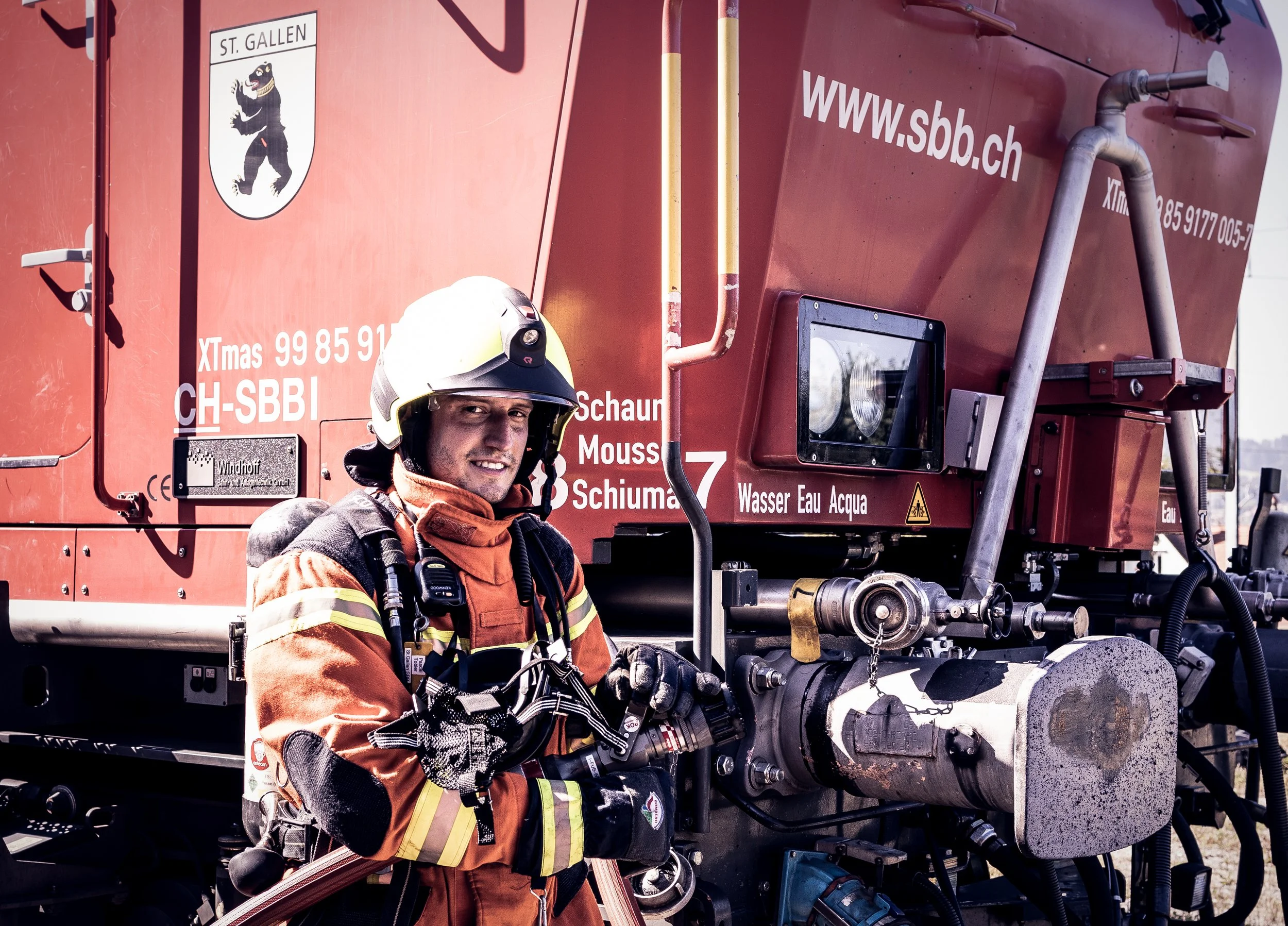 Feuerwehrmann in voller Ausrüstung steht vor einem roten Feuerwehrfahrzeug mit Website und Logo, hält einen Schlauch. Es ist sonnig. Im Vollbildmodus anzeigen