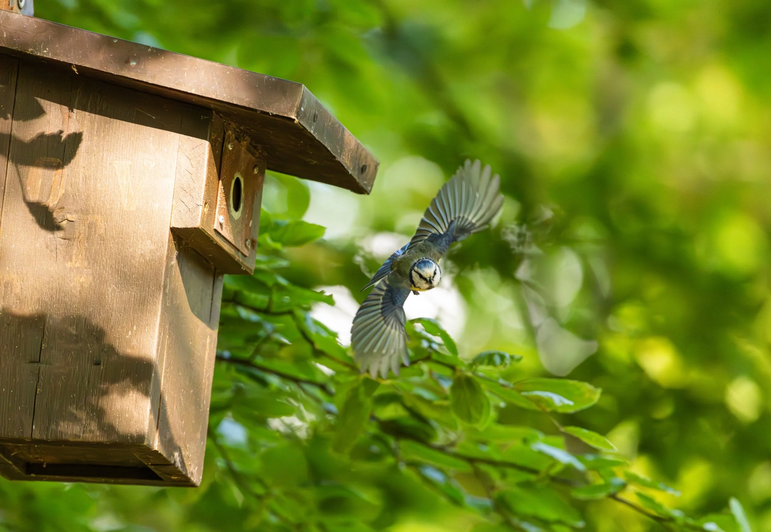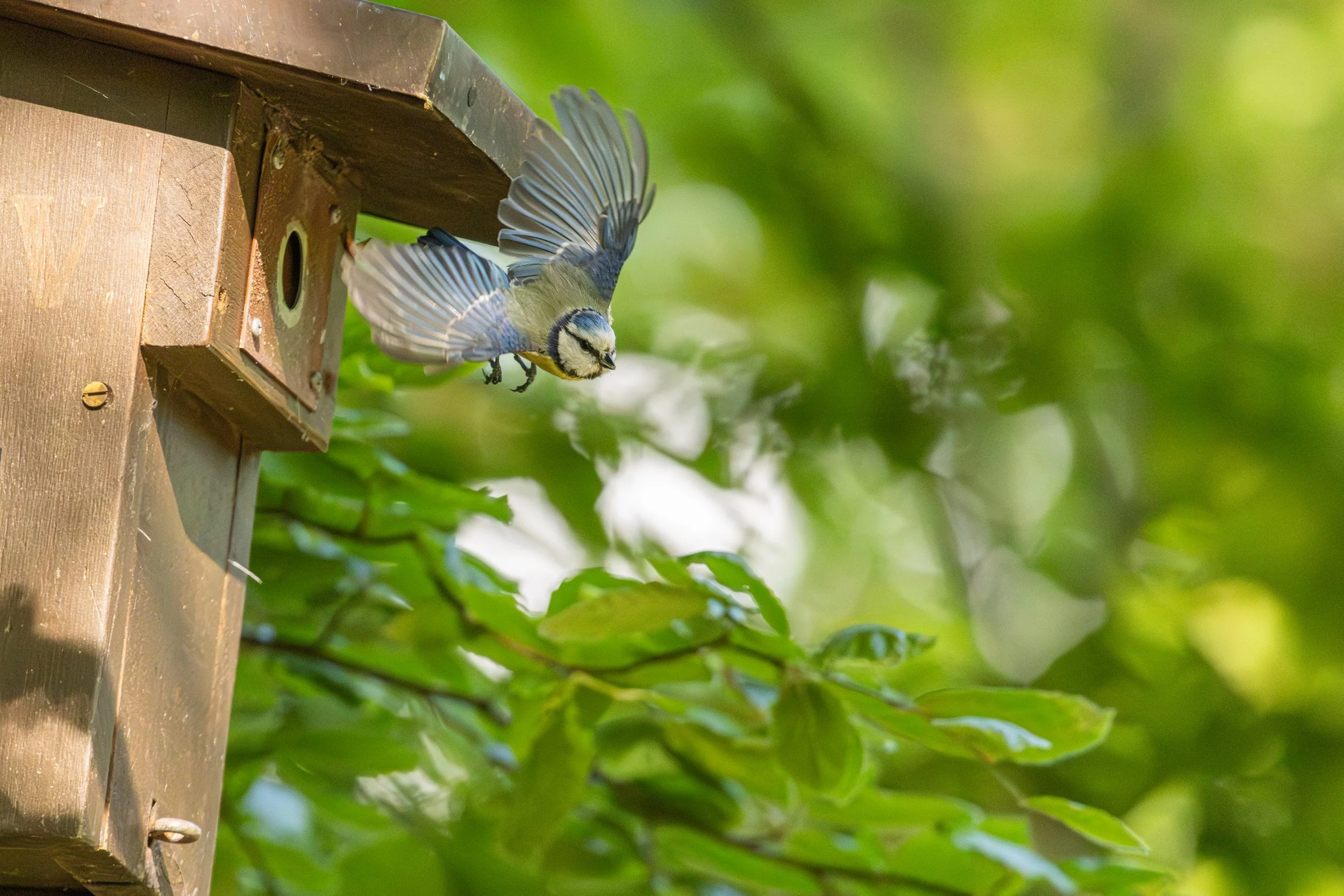 Ein Vogel fliegt aus einem Nistkasten, umgeben von grünen Blättern im Sonnenlicht.