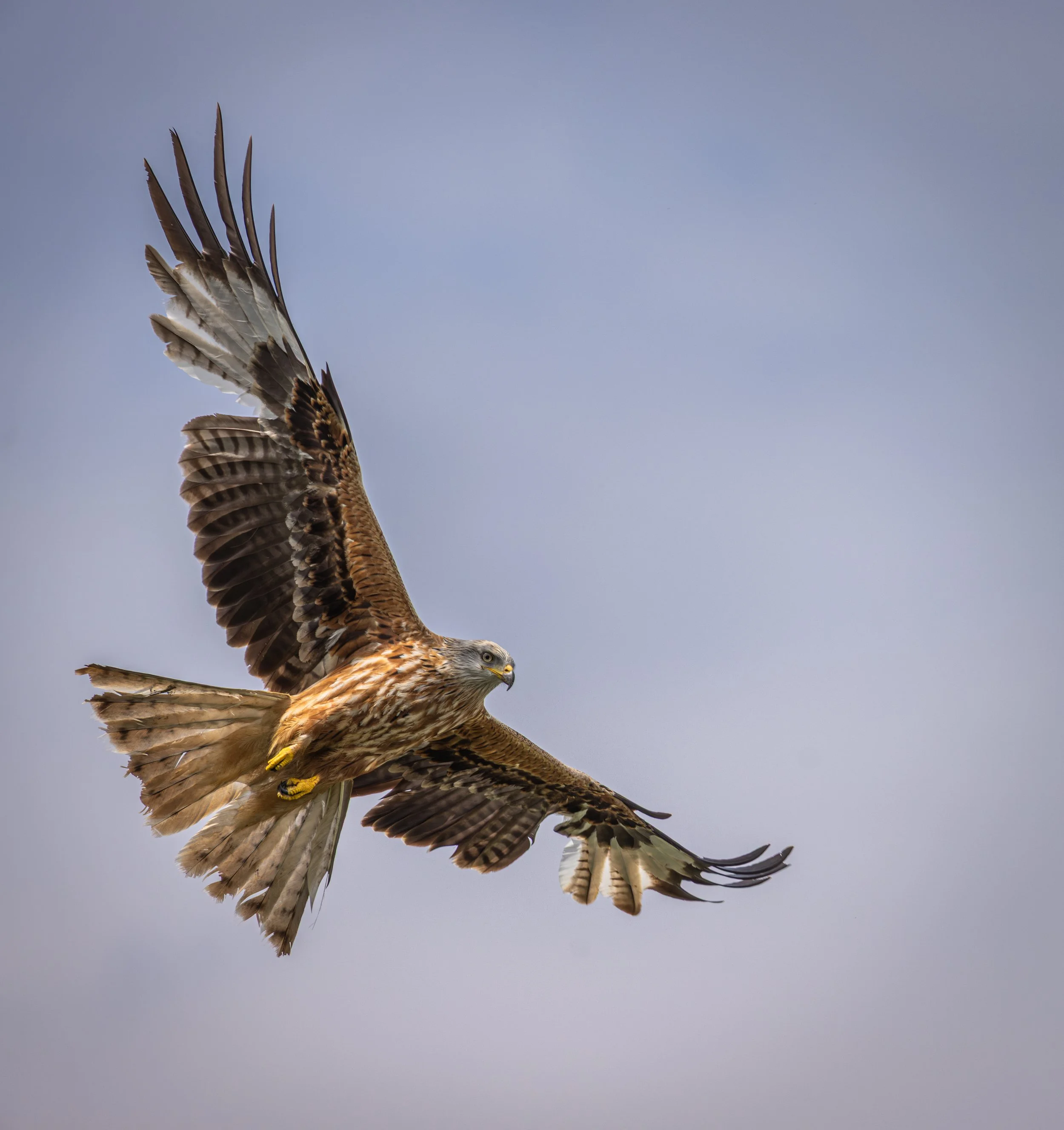 Ein fliegender Raubvogel, wahrscheinlich ein Falke, vor einem grauen Himmel.