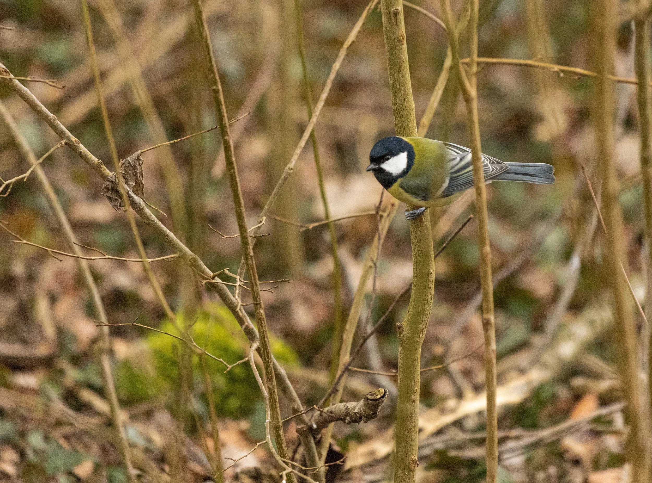 Ein gelber und schwarzer Vogel sitzt auf einem dünnen Ast in einem dichten Gebüsch. Im Vollbildmodus anzeigen