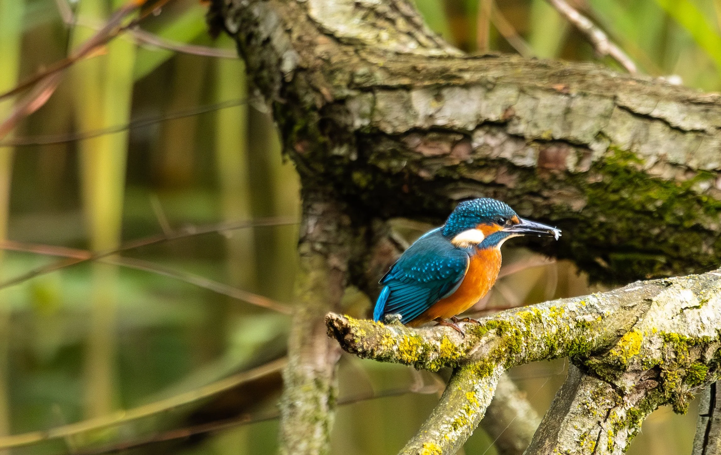 Ein bunter Vogel, vermutlich ein Eisvogel, sitzt auf einem Ast vor einer grünen Vegetation.