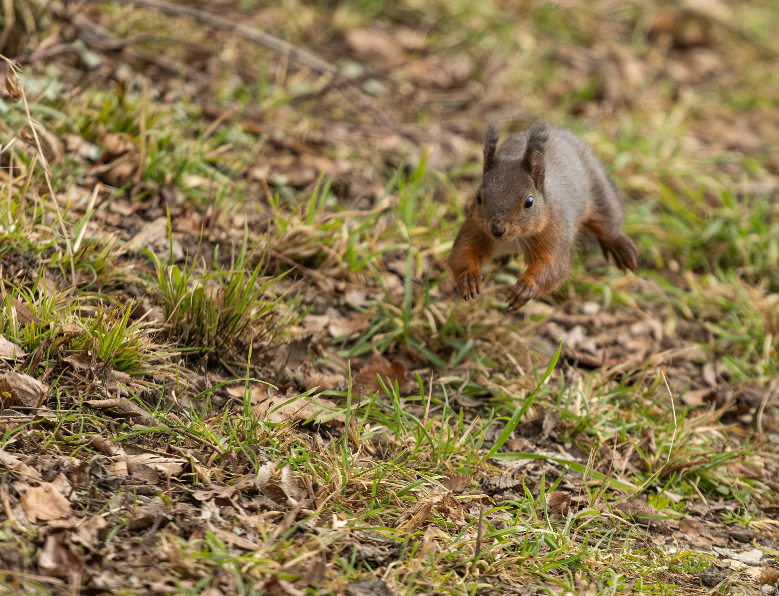 Ein Eichhörnchen läuft springend durch das Laub auf dem Boden, umgeben von Blättern und Grashalmen.