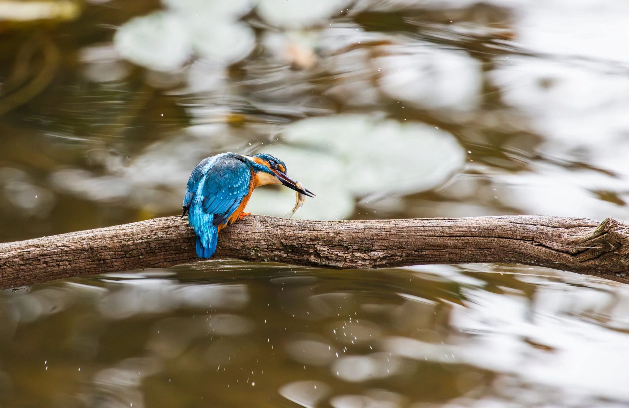Ein blauer und orangefarbener Eisvogel sitzt auf einem Baumast über einem Teich mit Wasserlilien.